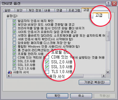 7) "SSL 2.0 사용"과 "SSL 3.0 사용"에 에 체크 후 [확인] 클릭