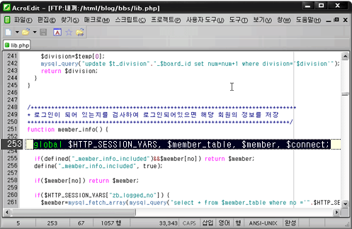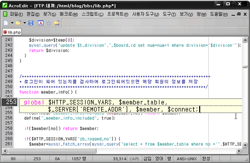 3. 이 때 global $HTTP_SESSION_VARS, $member_table, $REMOTE_ADDR, $member, $connect; 이라는 부분에서는 global $HTTP_SESSION_VARS, $member_table, $member, $connect; 로 변경합니다.