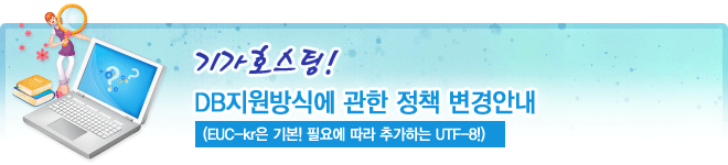 기가호스팅>신규신청서 작성>DB타입 추가>UTF-8 선택 - UTF-8 DB 추가 선택 시, DB타입 추가비용 발생 - 기가호스팅은 EUC-kr을 기본으로 하며, UTF-8만 사용하고자 하실 경우 유니호스팅을 신청하시기 바랍니다.
