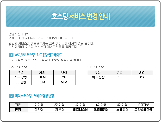ASP/JSP/리눅스 호스팅 서비스 변경 안내
