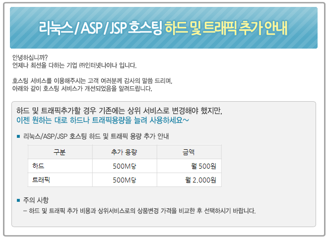 리눅스/ASP/JSP 호스팅 하드 및 트래픽추가안내
