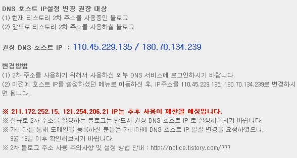 티스토리 블로그의 네임서버 IP주소가 변경되어 블로그 연결 서비스를 이용 중이신 고객 여러분께 알려 드립니다.