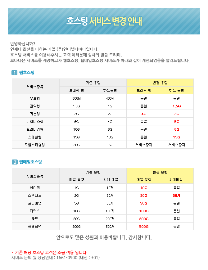 웹호스팅, 웹메일호스팅 서비스 변경 안내